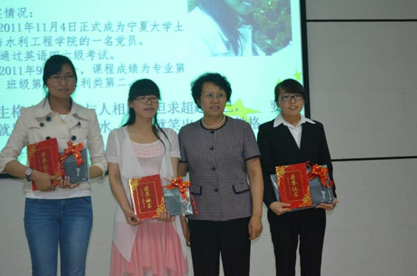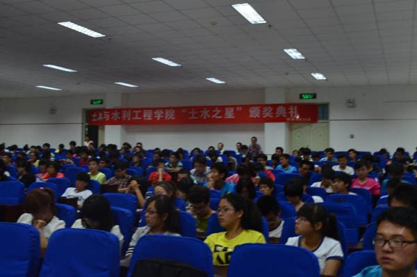 于5月23日在文科楼一楼报告厅举办以“传递青春正能量 奋发有为成栋梁”为主题的第一届“土水之星”颁奖典礼。宁夏大学党委副书记赵利宁,纪委书记孔斌,院长田军仓,党总支副书记王德全、张强,副院长尹娟、毛明杰、李应海等领导出席了颁奖典礼。