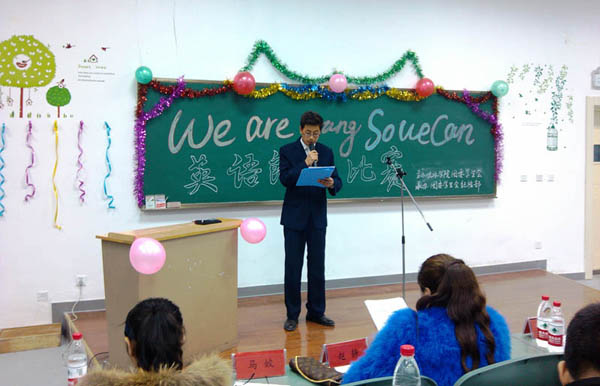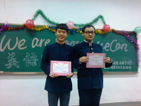 比赛现场气氛热烈,同学们个个精神饱满,仪表端庄,信心十足。比赛分朗诵和创新两个环节。选手们朗诵的文章有优美抒情的散文,有妙趣横生的故事,也有激情洋溢的议论文。在创新环节,选手们更是拿出了自己的看家本领,他们通过演唱经典英文歌曲,说英语绕口令,讲幽默笑话和报导时事新闻等方式大展自己的才华。最终2012级土混1班的藤潇宇同学凭借个人优异的表现获得一等奖。