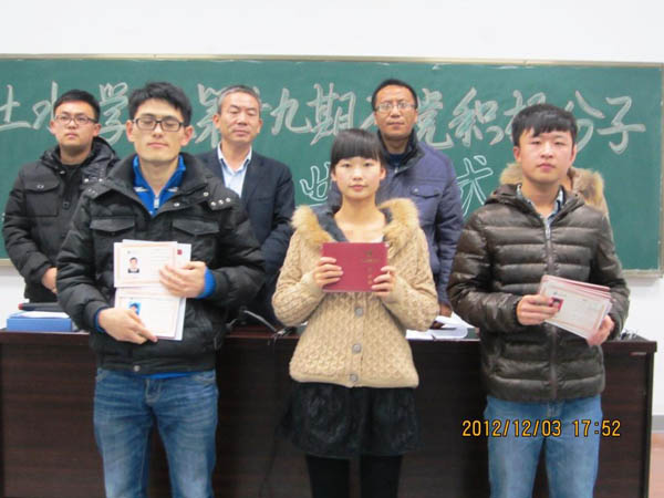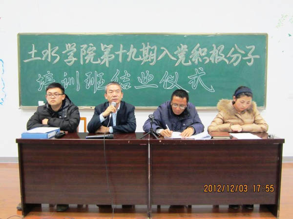 结业仪式在庄严地国歌声中拉开帷幕。张强副书记首先做了党课的培训小结,他对通过结业的学员圆满完成学习任务表示祝贺。张书记希望,广大入党积极分子要充分认识到培训班的结业是另一个新的起点,在工作、学习、生活中要切实发挥入党积极分子的模范带头作用。2011级农业水利班的吴明哲同学代表全体学员从不同角度阐述了对党的认识和迫切加入党组织的信心和决心,并表示要不断加强对党的理论知识的学习,从实践中提高自我、明确责任。接着,与会的领导和老师们为学生代表颁发了结业证书。最后,王德全副书记结合入党积极分子的培训目标和要求,对广大入党积极分子提出了殷切的希望。他希望同学们珍惜难得的机遇,在日常生活中要关心社会、关注时事,不断坚持政治理论的学习,在言行和思想上都要时刻以党员的标准来检验自己,争取早日加入党组织。