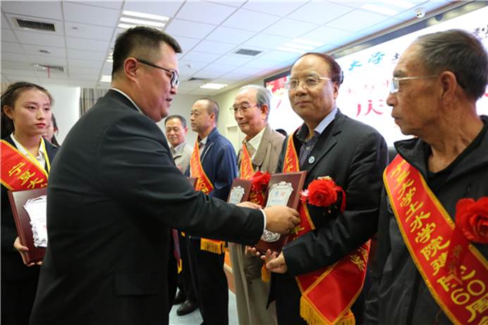 庆祝大会前,澳门威尼斯人app 向退休老领导、老教师、校友赠送了建院六十周年画册,并组织了老领导座谈会和四个系校友、教师座谈会,座谈会结束后,与会全体校友、教师及学生代表合影留念。