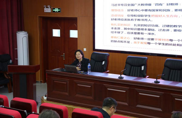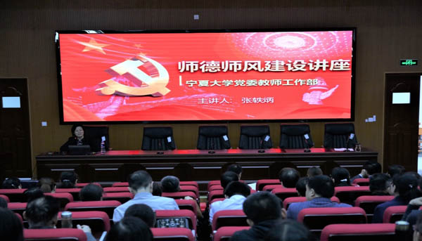 张教授从古今中外对师德师风基本内涵的理解认识,结合对习近平总书�2018�5�2日在北京大学的讲话和2018�9�10日在全国教育大会上的讲话精神的学习领会,重点阐述了坚持立德树人、强化教师队伍建设的重要性。她详细解读了《教育部关于建立健全高校师德建设长效机制的意见》和《新时代高校教师职业行为十项准则》等师德师风建设相关文件精神,同时对教育部《十项准则》与《宁夏大学师德失范行为处理办法(实行)》进行了对照说明。生动的讲座使与会教职工加深了对师德师风建设重要意义、重点工作的理解,进一步牢记肩负的历史使命和职责,进一步明确师德师风和教师职业道德的底线、红线、高压线。对全面贯彻全国高校思想政治工作会议精神,全面加强学院师德师风建设工作都具有十分重要的指导意义�