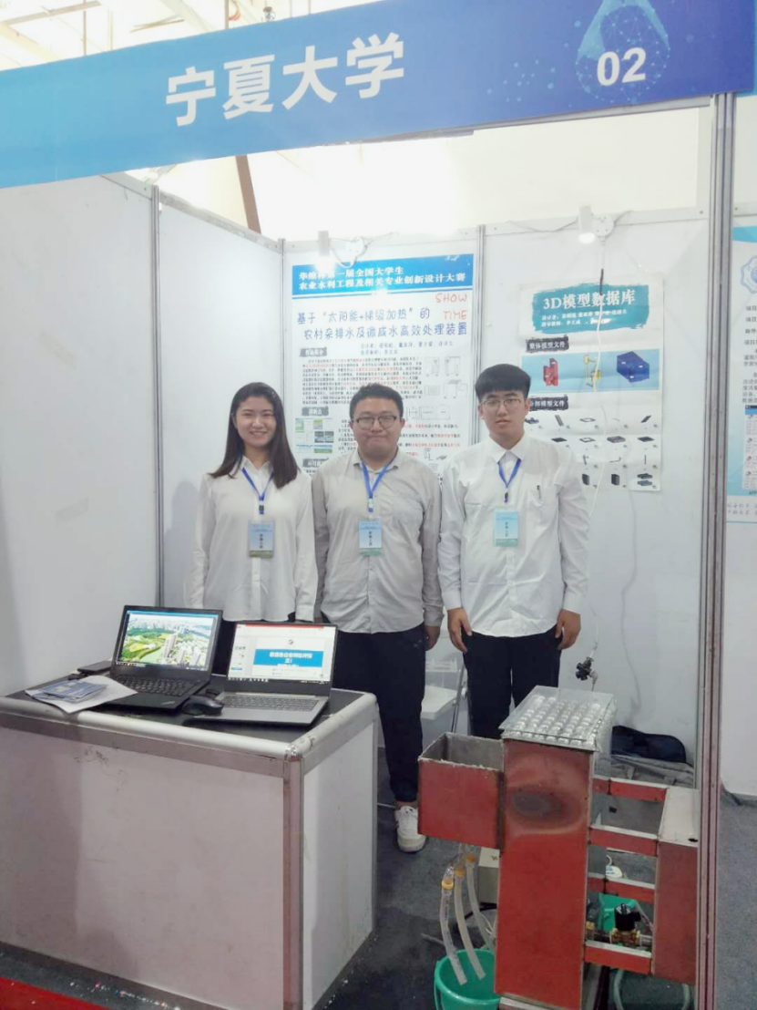本次比赛高手云集、比赛现场阵容强大,经过激烈角逐,由宁夏大学李王成老师指导,姜明旭、董亚萍、曹子萱、连泽立共同制作的“基于太阳能+梯级加热的农村杂排水及微咸水高效处理装置”喜获研究生创新组三等奖;刘娟老师指导,王平、赵雪梅、魏红宁,彭锐共同制作的“智能正渗透水肥自补给系统”喜获本科生创新组一等奖;申晓晶老师指导,郑娇萌,锁丽燕,陈颖琦,李启航共同制作的“基于生活废水多级回用的室外局部小气候调节装置”喜获本科生创新组二等奖;燕宁娜老师指导,黄一凡,张天然,靳文兵,郑娇萌共同制作的“吾所居兮——宁夏移民新村农宅风貌本土化营建”喜获本科生创新组二等奖;冯东溥老师指导,姚菲、吴星、吴萍、徐玉卿共同制作的“农村饮用水水质净化及预警系统”喜获本科生创业组二等奖;王德全老师指导,马慧娟、马龙、曹雪妮,姜明旭共同制作的“水之蓝,梦之蓝”喜获本科生创业组二等奖;