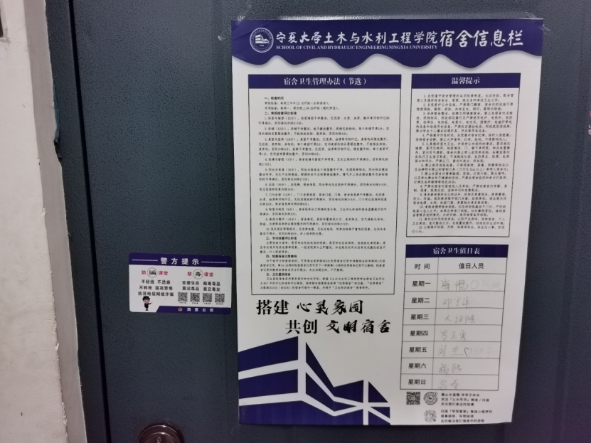 宿舍信息栏由《宿舍管理办法(节选)》、温馨提示和宿舍卫生值日表三个部分组成,充分体现澳门威尼斯人app
