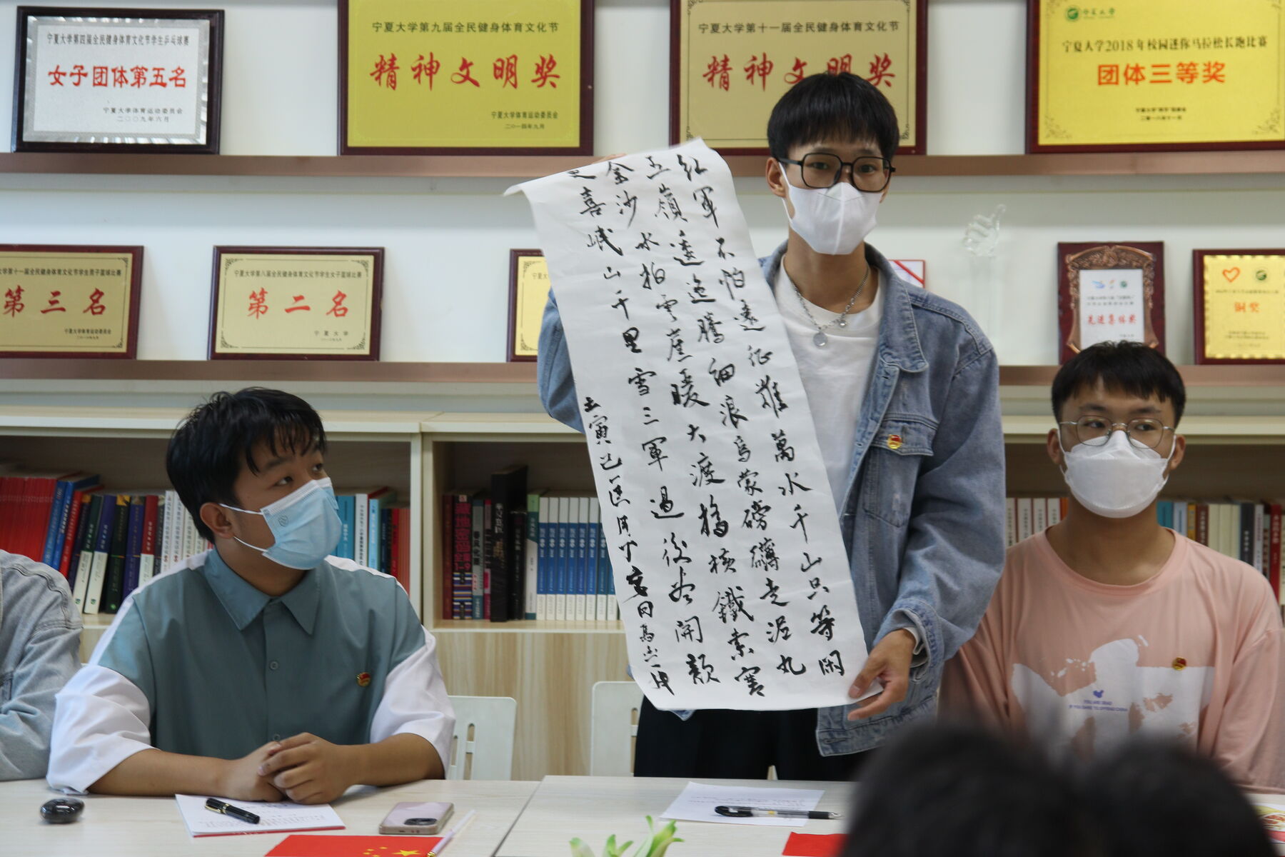 “二十四节气”特色团日活动的成果手绘画及自己为了庆祝国庆节所创作的书法以及绘画作品,同时,同学们也从校园防疫活动、三下乡社会实践经验、中国共产党百年奋斗重大成就等不同角度分享了自己体悟感受。