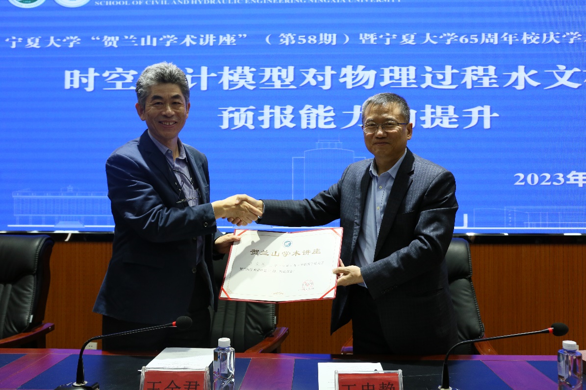 党委副书记尹娟主持,会前王忠静副校长向王全君教授颁发了“贺兰山学术讲座”证书与纪念册。