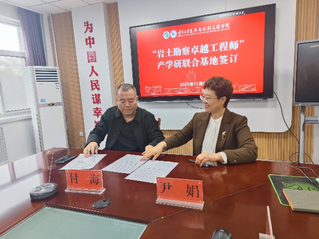 在与会人员的共同见证下,学院党总支书记尹娟教授与宁夏海辉岩土工程有限公司总经理付海代表双方签署了“岩土勘察卓越工程师”产学研联合基地框架协议。协议的签订,标志着校企合作进入了实质性的新阶段,为未来在人才培养、技术研发、成果转化等方面的深度合作奠定了坚实基础。