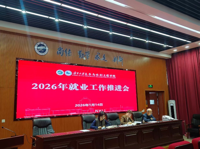 1�14日下午,土木与水利工程学院在知行楼三阶报告厅召开全院教职工大会暨2026届毕业生就业工作推进会。会后又在知行楼415会议室召开2026年就业工作专题推进会,学院领导班子成员、各系主任、系副主任和毕业班班主任参加会议,会议由学院党总支书记尹娟主持�