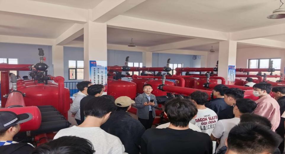 在二号蓄水池加压泵房,王炳亮老师结合工程实景,细致讲解现代化灌区灌溉体系的组成,对比传统渠道灌溉与现代滴灌、喷灌、智能灌溉的技术差异与应用场景,阐释智慧水利、现代化灌区以及现代农业生产的发展趋势在灌区一线的落地实践,帮助同学们把课堂上的水力学、灌溉排水工程学、水利工程管理等理论知识,转化为看得见、摸得着、用得上的工程实践能力。大家清晰理解了从水源调度、泵站加压、管网输送到田间精准配水的全链条运行逻辑,直观认识到节水优先、智能管控对保障粮食安全、推动农业现代化、建设生态灌区的重要意义,进一步夯实了专业基础、拓宽了工程视野,也更加坚定了以专业所学服务水利事业、助力乡村振兴与生态文明建设的理想信念。
