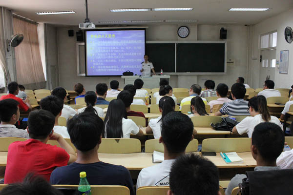 讲座伊始,陈警官以天津港“8·12”瑞海公司危险化学品仓库特别重大火灾爆炸事故为例引出了今天的讲座的主题,点出了消防安全在日常生活中的重要性。然后,陈警官为同学们分析了公安部消防局的统计数据,指出全国每年都有大量的人员死于消防知识的欠缺。他说:“我国消防工作以预防为主,防消结合”,并分析了生活中一些常见的火灾隐患,以及火灾发生的种种原因,即:缺少专业灭火、逃生技巧,缺少自防自救、逃生技能。之后,陈警官为同学们讲解了干粉灭火器、水基灭火器、气溶胶灭火器使用方法以及注意事项,并呼吁同学们:“安全不能等待,生命不能重生,我们必须吸取教训,敲响安全警钟”。