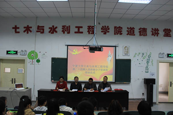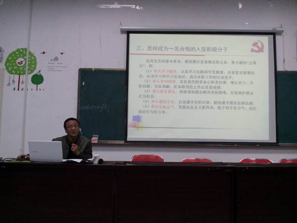 党委副书记王德全老师做了涵盖端正入党动机、如何成为合格的入党积极分子、十八届四中全会解读等方面内容的专题讲座,学员们受益匪浅。在分组讨论阶段大家纷纷表示要从现在做起,不断增强政治意识,提高政治觉悟,争取早日加入中国共产党。4月15日,结业仪式顺利举行,学员代表进行了交流发言,表示要把党课结业作为新的起点,争做学生中的表率,以实际行动向党组织靠拢。