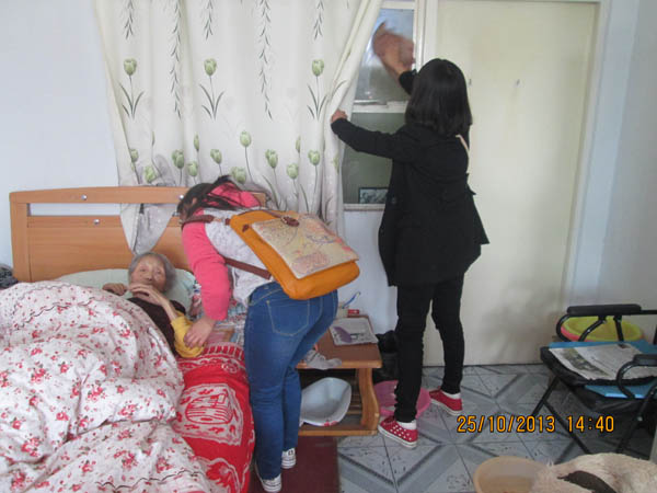 在实践部的安排下,敬老、助老活动正式展开,同学们分为若干个小组,各有分工。志愿者们有的陪老人们聊天,有的为老人捶背,有的帮助老人整理内务、打扫卫生,还有几名志愿者即兴唱起了红色革命歌曲。同学们还贴心的为老人们办了题为《我健康 我快乐》的板报。