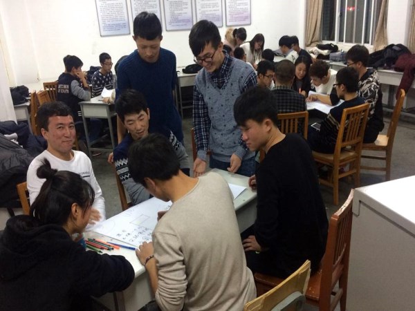 的学姐走进土木一班的教室,同学们全体起立,对学姐的到来表示热烈欢迎。她给同学们带来的是融入活动的简单的运动操,同学们虽然做起来笨拙滑稽、不搭调,但是每个人的脸上还是洋溢着温暖的笑容。游戏环节,大家以五个人为单位,组成一个虚拟宿舍,每个宿舍拥有一张报纸,五个人绞尽脑汁将报纸折到最小并全部站在上面,相互搀扶,手牵手,像亲人、像战友,并肩战斗。随后,每个宿舍的成员在同一张纸上画上宿舍蓝图,其中,一副灵感来自于成都杜甫草堂的作品:《草堂》脱颖而出,倡导同学们节俭戒奢、博学多才。最后一个游戏,名为“信任圈”,圈虽小,“信任”一词却显得深远,倒下的一瞬间,是因为相信自己会被接住,同学们都没有丝毫的担心,大胆尝试。最后,由班级代表发表感言。持续了两点半小时的朋辈辅导在一片掌声中圆满结束,今晚的工科楼显得格外温馨。