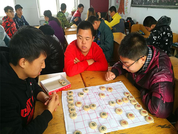 我们对残障儿童及残障青少年的理解大概是从进门那阵别致的掌声开始,孩子们鼓掌欢迎我们,我们十分惊喜。老师向他们介绍了我们,听说我们是宁夏大学的,就知道又是哥哥姐姐来看他们了,开心地又鼓起掌。在几个志愿者帮助家园打扫陈列室的同时,其他志愿者耐心地陪伴这些孩子。吴忠涛喜欢写字,他有自己的纸笔,写起字来开心的不得了,我让他来给我们看看,他一笔一划的默写《三字经》。一位志愿者和他玩起了三字经接龙,他竟然对答如流;不写字的时候他会指着墙上的宣传报刊念念有词。他们对象棋的兴趣不小,不时还有各种可爱的提问,陪他们玩的志愿者耐心讲解其中道理。有个小姑娘很爱唱歌,志愿者就找出了她喜欢的《明天,你好》,其中有句歌词很应景:时间它总说慌,我从不失去那些肩膀……