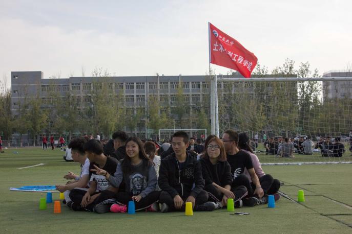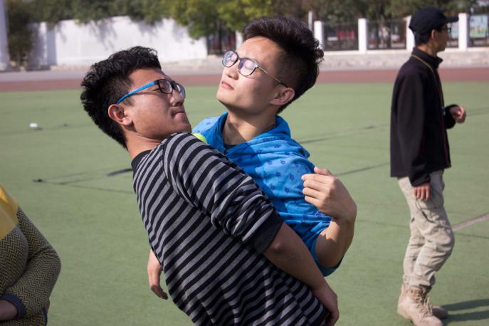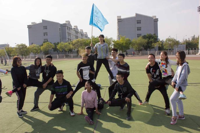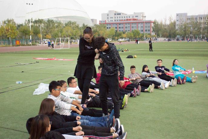 随后,教练要求每个队分别选取队长,确定队名,设计口号、Logo、队歌、团队造型等。十五分钟后,三个队长选举出炉,并为大家介绍了讨论的成果。三个队伍分别取名为“英雄联盟队”“爱对不队”和“拆迁队”。在队长介绍的过程中,活动场上传来此起彼伏的笑声,略显陌生的学生干部开始变得融洽,无形的默契渐渐形成。