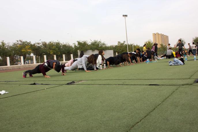 活动伊始,为了锻炼大家的合作意识,教练首先带领大家进行了“快乐传递”。42名学生干部被分成了三队,以团队作战的方式用下巴传递网球。女生略显尴尬的笑容表明这将是一件难以完成的任务,但是在教练的指导下,大家通过反反复复地尝试,最终都获得了成功。经过首发项目的热身后,大家对彼此都有了初步的了解,也为本次活动奠定了基调。