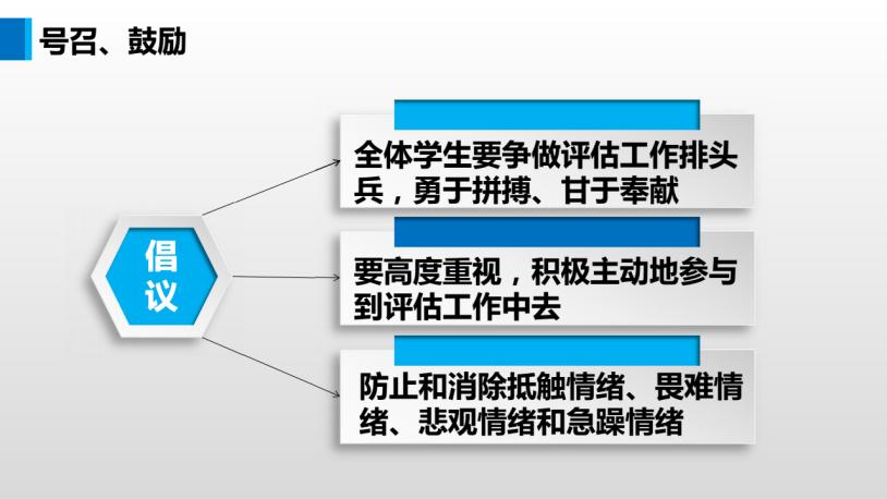 有足够的自信感、责任感。熟练掌握《评估手册》、《迎评估学生行为规范》等规章制度,规范在校期间的点滴行为,从我做起,用心为校做力所能及之事。他要求,同学们要客观的看待目前学校发展现状,从大局出发,客观的与专家反应、交流校情和院情,用最规范的行为,迎接评估,争做评估的排头兵。
