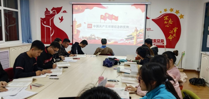 王娅茹同志只要从三个方面坚定的理想信念、理想信念的特点、坚定理想信念的优势进行讲解。理想是对未来事物的美好想像和希望。理想作为一种思想意识,是一个人的政治立场、世界观和人生观的集中表现;信念是指人们对现存的或可能的事物、观念等的正确性和正义性的坚定不移的确信和笃信;信仰是人对人生观、价值观和世界观等的选择和持有。是对某种主张、主义、宗教或某人及其相信和尊敬。让大家明白理想、信念、信仰的概念。随后,王亚茹同志提出两个问题:1.什么是共产党人的理想信念?坚定的理想信念是共产党人安身立命的根本。共产党人的理想信念就是对马克思主义的信仰,对社会主义和共产主义的信念。2、为什么要坚定理想信念?习近平总书记指出:“坚定理想信念,坚守共产党人精神追求,始终是共产党人安身立命的根本。理想信念就是共产党人精神上的钙,没有理想信念,理想信念不坚定,精神上就会缺钙,就会得软骨病。”