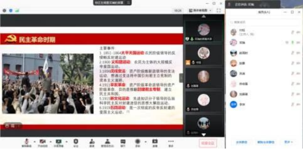 4月9日下午,党史学习讨论党小组在腾讯会议召开线上会议,会议主题为党史学习教育。第一部分:根据上次会议组员选择的阶段进行内容讲解。买瑞同学讲述了中国共产党历史的民主革命阶段的主要内容,并且从理论发展角度来描述党史发展的脉络,和其他成员进行讨论和学习。通过学习必将增强我们对党的感情认同、理论认同、政治认同。对继承和发扬光荣革命传统、党的优良作风,对提高自己的认识能力和处理实际问题的能力都是十分必要的和有益的。第二部分:同学们各自学习了《论中国共产党历史》这本书,根据书中的各个主题章节,进行自主学习,需要时可选择书籍批注和读书笔记学习。