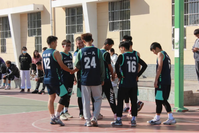 队。比赛开始前,队员们互相握手,摩拳擦掌,斗志昂扬,为大家呈现了积极向上的精神面貌。 随着裁判哨声一吹,球向上扔出,参赛队员们都高高蹿起,开启了一场惊心动魄的篮球比赛。