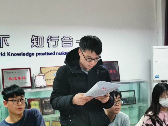各位发展对象按照顺序汇报自己对党的认识、入党动机、本人履历、家庭和主要社会关系情况以及需向党组织说明的问题,并表达了自己坚定的入党决心。相应的入党介绍人介绍发展对象的有关情况,并对其能否入党表明意见。随即组织委员丰丽阳和宣传委员陈涛向支部大会报告对发展对象的政治审查和群众座谈结果,同时与会党员也针对各位发展对象进行讨论和发表意见。