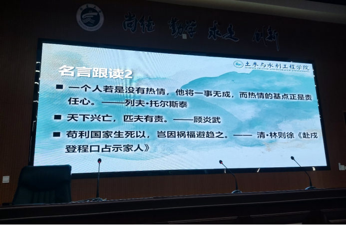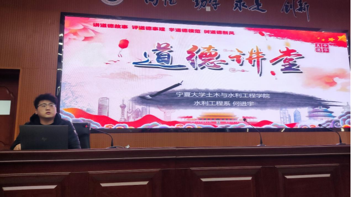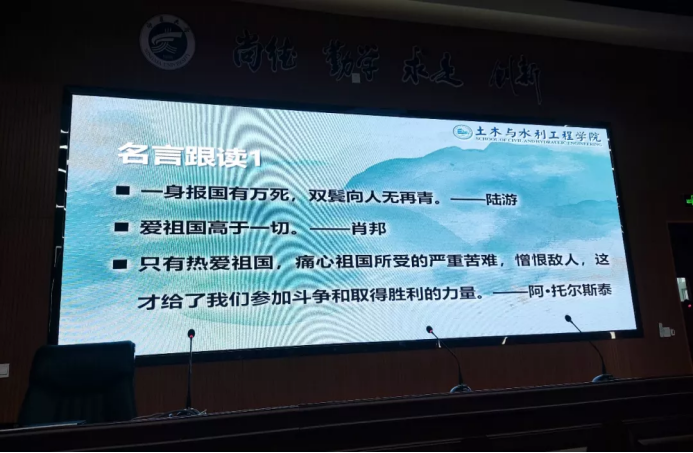 于知行楼三楼阶梯教室开展了主题为“爱国,责任,勇毅”的道德讲堂活动,旨在传承民族精神,弘扬爱国主义,高举爱国主义旗帜,真正把爱国之志变成报国之行。本次讲堂由水利工程系副教授、党支部书记何进宇老师主讲,研究生辅导员徐浩老师、澳门威尼斯人app