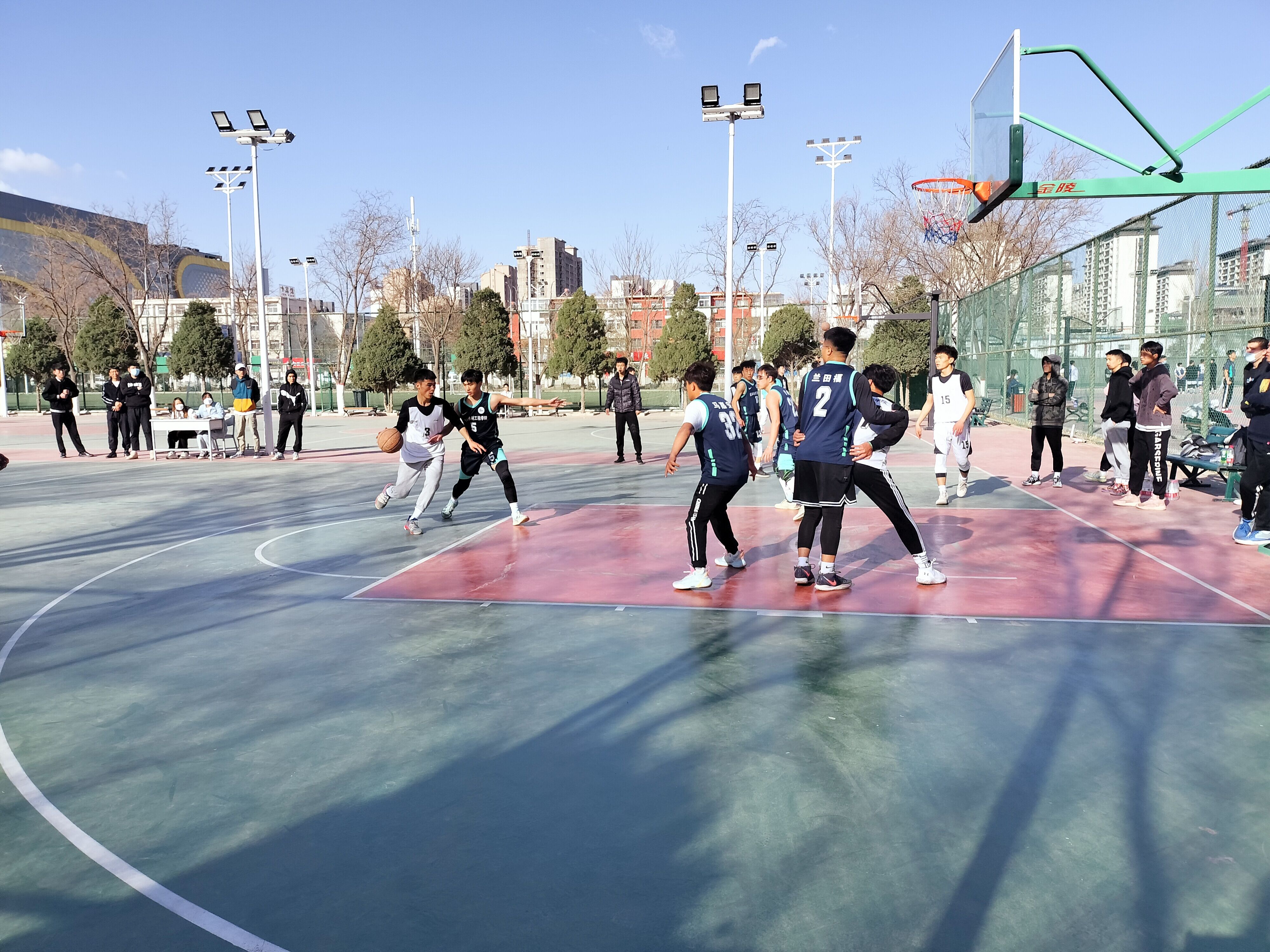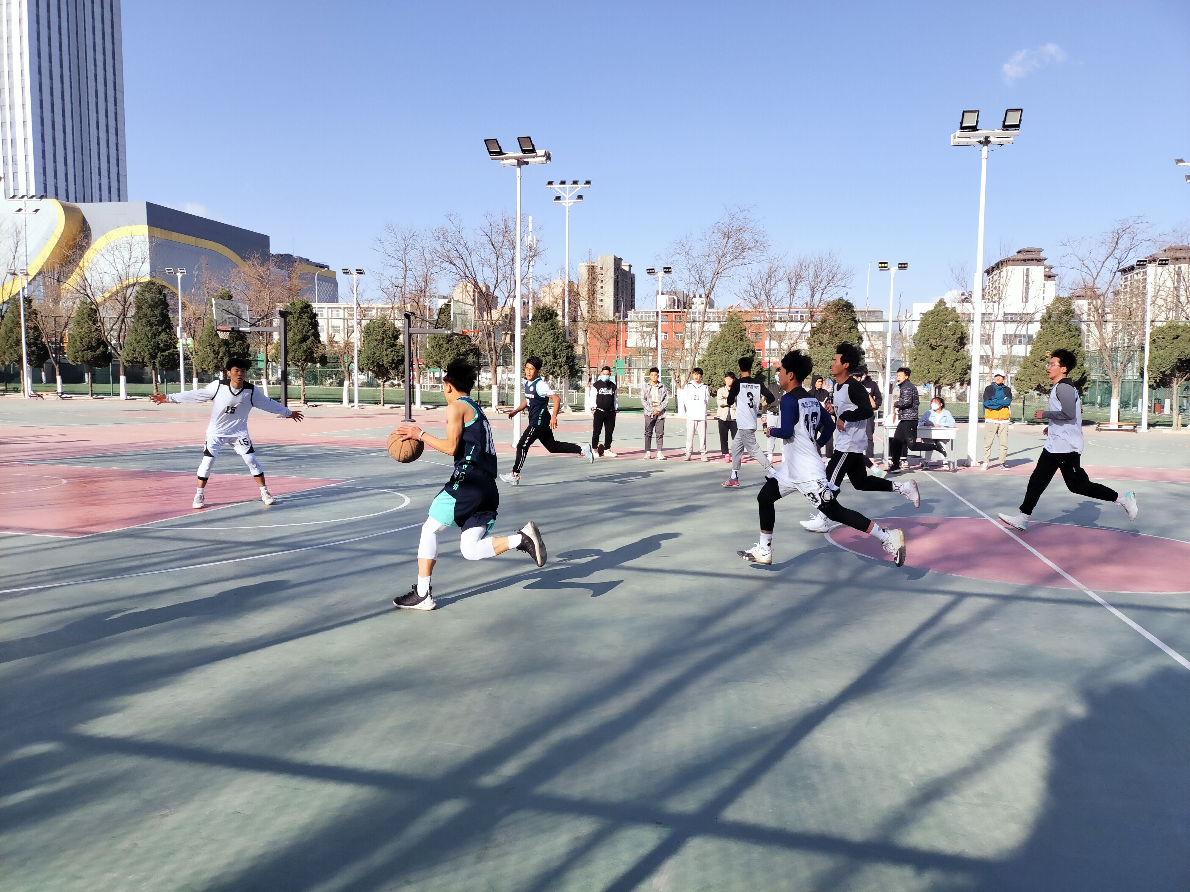 展开了一场精彩的篮球比赛。此次比赛的胜利方将在土水男篮和机械男篮诞生。两支队伍狭路相逢,吸引了许多同学前来观战。