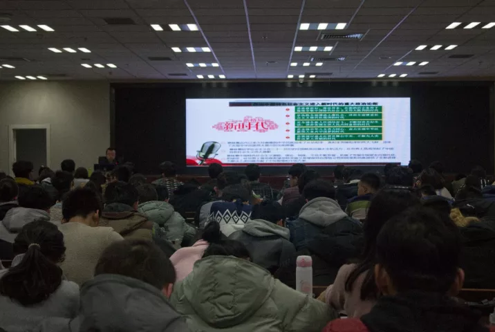 党锐锋老师通俗易懂、声情并茂地为同学们解读了中国共产党第十九次全国代表大会整体流程及习近平总书记十九大报告内容,他利用图片组与音视频结合的方式详细阐明了大会报告的形成过程,从大会的主题,大会的盛况,大会的主要成果三个方面展开了详细介绍。他还阐述了有关全方位外交布局深入展开的内容,使同学们对“推动构建人类命运共同体,书写中国特色大国外交新篇章”有了更近一步的认识。接下来他综述了党的十八大以来全面从严治党的成就,并且概述了中国特色社会主义进入新时代的重大政治论断。宣讲活动最后,党老师提议所有同学齐颂毛泽东同志的著名诗词《沁园春•雪》,让同学们在激情的朗诵中再一次体会身为新时代中国人的自豪感。